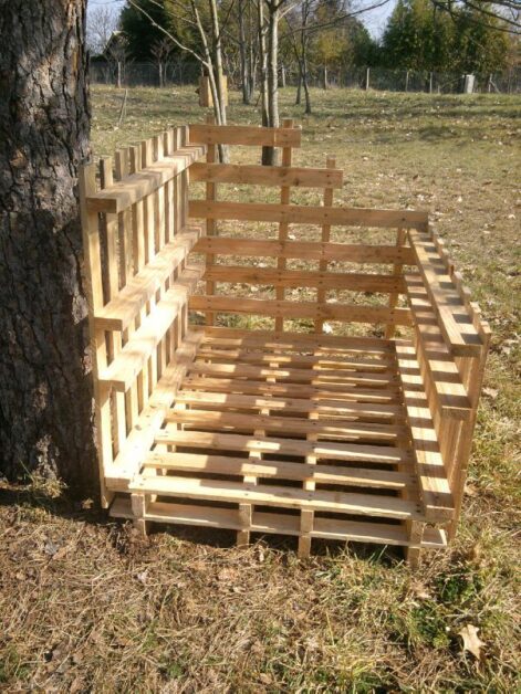 - Assembler les murs : utiliser 4 palettes pour faire une base carrée. Renforcer les angles avec des tasseaux et des vis inox. Combler les interstices avec des planches coupées au gabarit pour limiter les courants d’air sans empêcher la ventilation.
