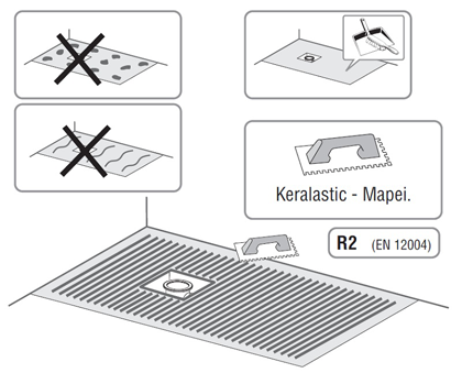Avant l’application, traiter la dalle : dépoussiérage, réparation des trous, primaire si recommandé. Appliquer la colle en plots ou bandes et positionner le bac en vérifiant le niveau. Laisser sécher selon la fiche produit.